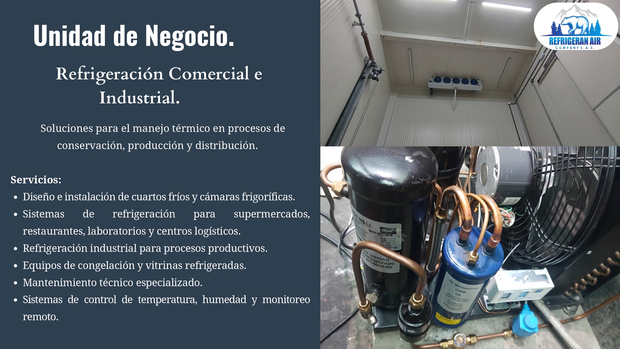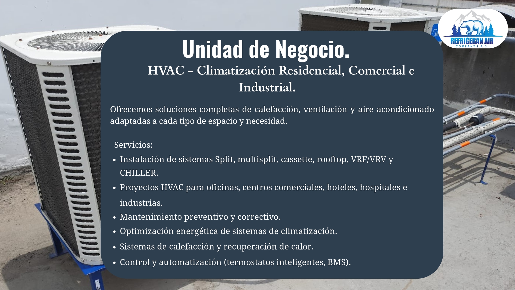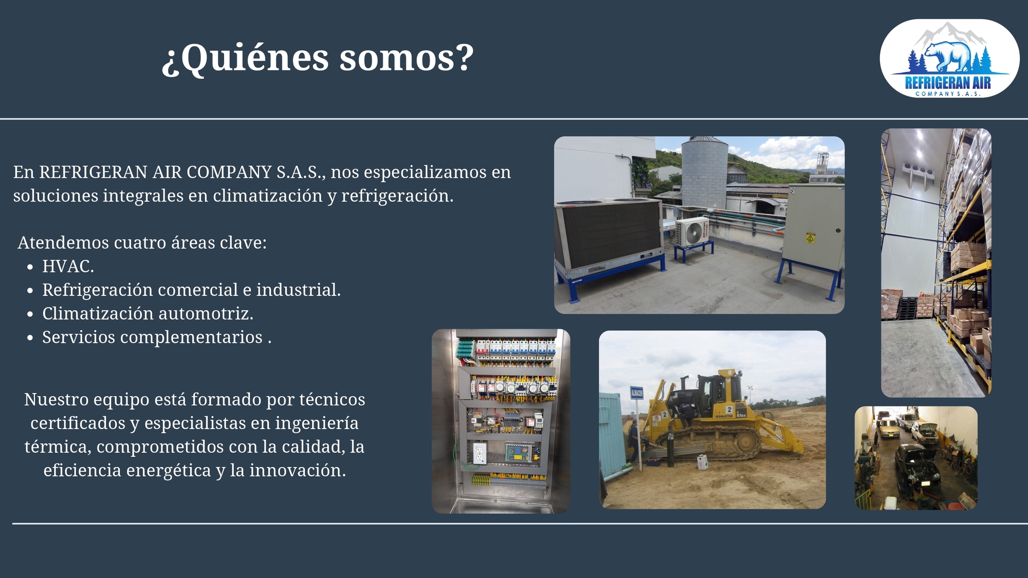 En REFRIGERAN AIR COMPANY S.A.S., nos especializamos en soluciones integrales en climatización y refrigeración. Atendemos cuatro áreas clave: HVAC. Refrigeración comercial e industrial. Climatización automotriz. Servicios complementarios . ¿Quiénes somos? Nuestro equipo está formado por técnicos certificados y especialistas en ingeniería térmica, comprometidos con la calidad, la eficiencia energética y la innovación.
