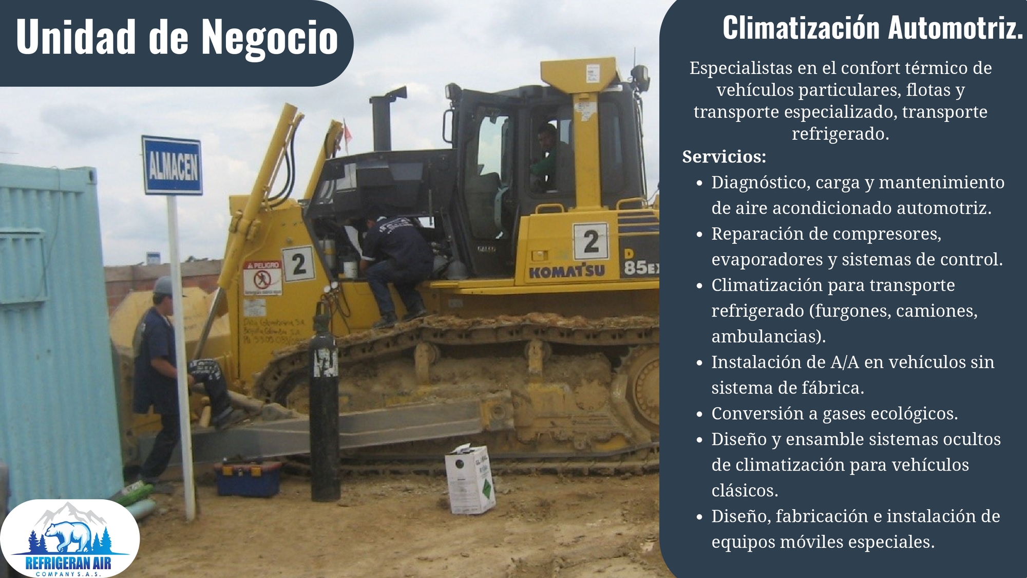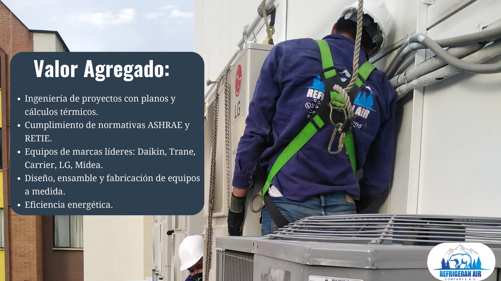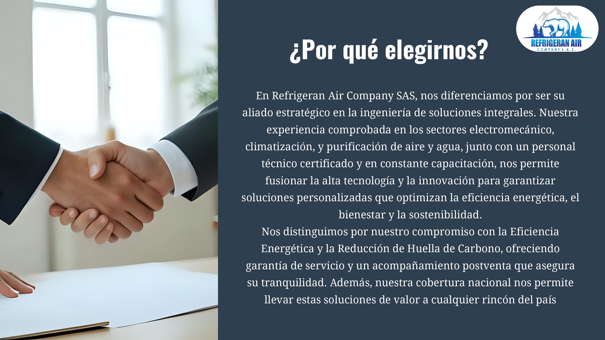 En REFRIGERAN AIR COMPANY S.A.S., nos especializamos en soluciones integrales en climatización y refrigeración. Atendemos cuatro áreas clave: HVAC. Refrigeración comercial e industrial. Climatización automotriz. Servicios complementarios . ¿Quiénes somos? Nuestro equipo está formado por técnicos certificados y especialistas en ingeniería térmica, comprometidos con la calidad, la eficiencia energética y la innovación.